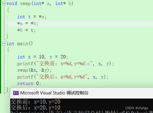 我这里自定义一个swap函数来交换x和y的值,当然你也可以直接在main函数数内通过中间变量来交换这两个的值。在代码中,调用swap函数来改变x,y的值,这里把x,y的地址传到swap函数里,再用两个指针来接受两者的地址。在函数体内通过一个中间变量来改变x,y的值。(传址调用)