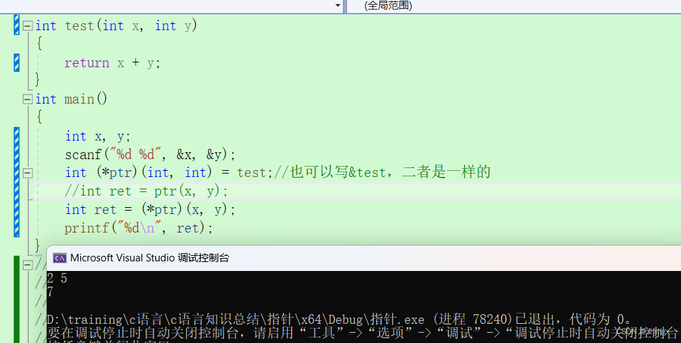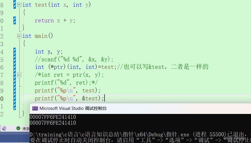 在下面代码中,我们创建了一个函数指针来存放函数test的地址。那么后续我们就可以通过指针来调用test函数。对于指针,我们可以解引用也可以不解引用,二者都可以写。