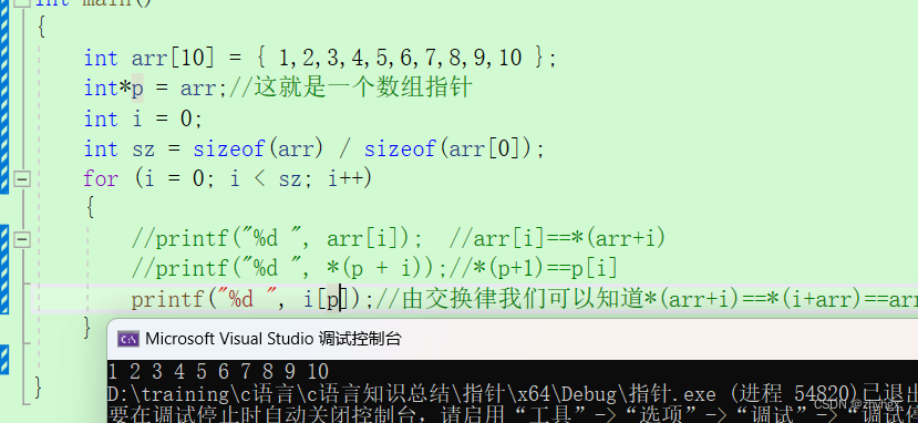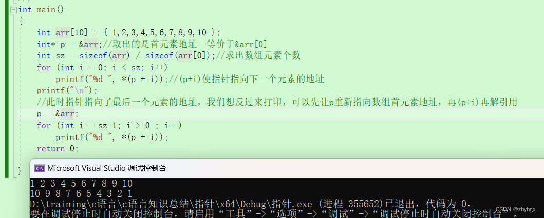//此时指针指向了最后一个元素的地址,我们想反过来打印,可以先让p重新指向数组首元素地址,再(p+i)再解引用
