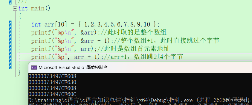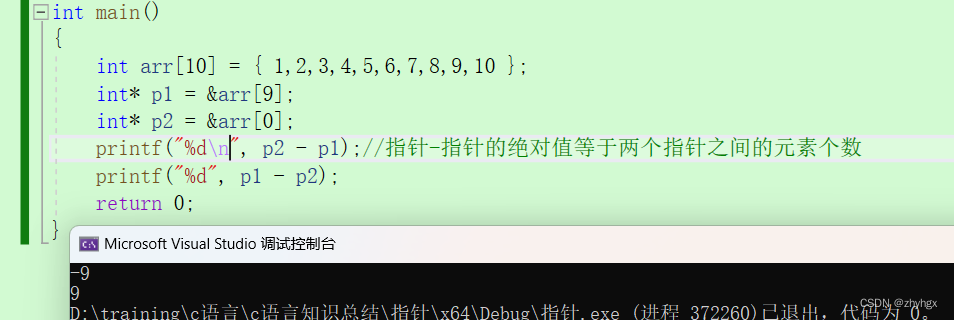 1.我们可以看到两个指针,一个指针存放第10个元素的地址,一个存放第1个元素,那么它们相减自然就可以的出它们之间有9个元素。