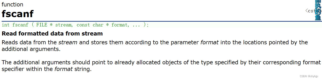 int fscanf ( FILE * stream, const char * format, ... );功能:从一个流中执行格式化输入,fscanf遇到空格和换行时结束。