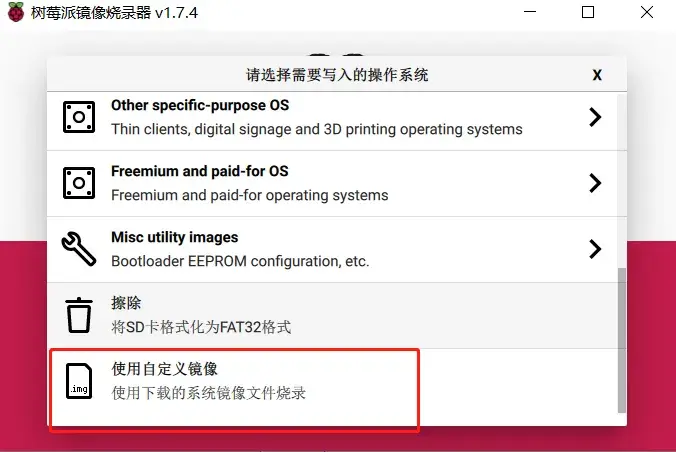 下载完成后选择使用自定义镜像,然后插SD卡,烧录就行。