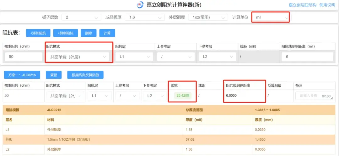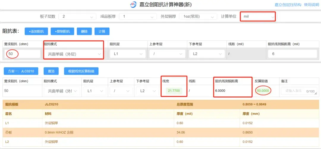 下面是立创阻抗计算器网址,如果有其他线宽和叠构需求,请自行计算;投板的时候请将需要阻抗控制的线段高亮截图给板厂,要求板厂按要求进行微调管控。
