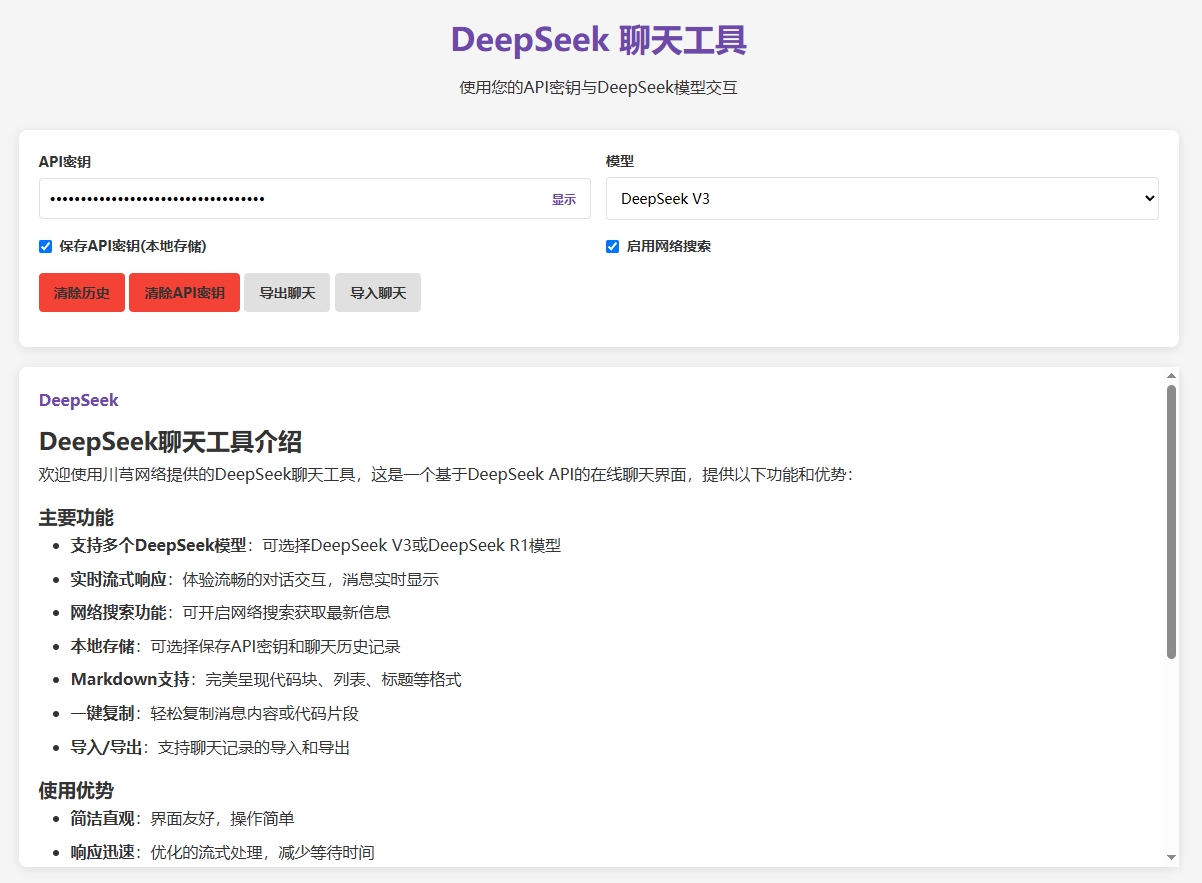 川芎网络在线工具箱(https://gongju.chuanxiong.net/deepseek)提供了一个优雅的解决方案。这个第三方平台允许用户输入DeepSeek官方提供的API接口,实现以下优势: