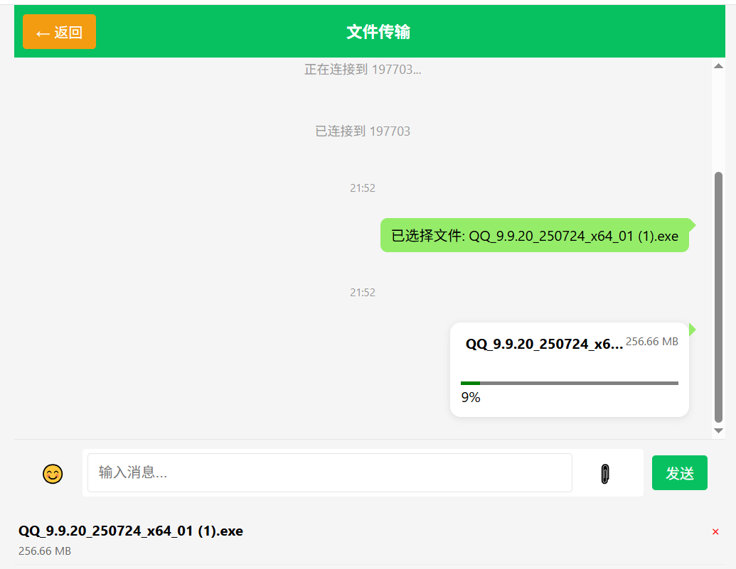 双界面布局:包含“连接界面”(输入6位ID建立连接)和“聊天传输界面”(文件列表+进度显示+即时聊天),逻辑清晰,操作门槛低。