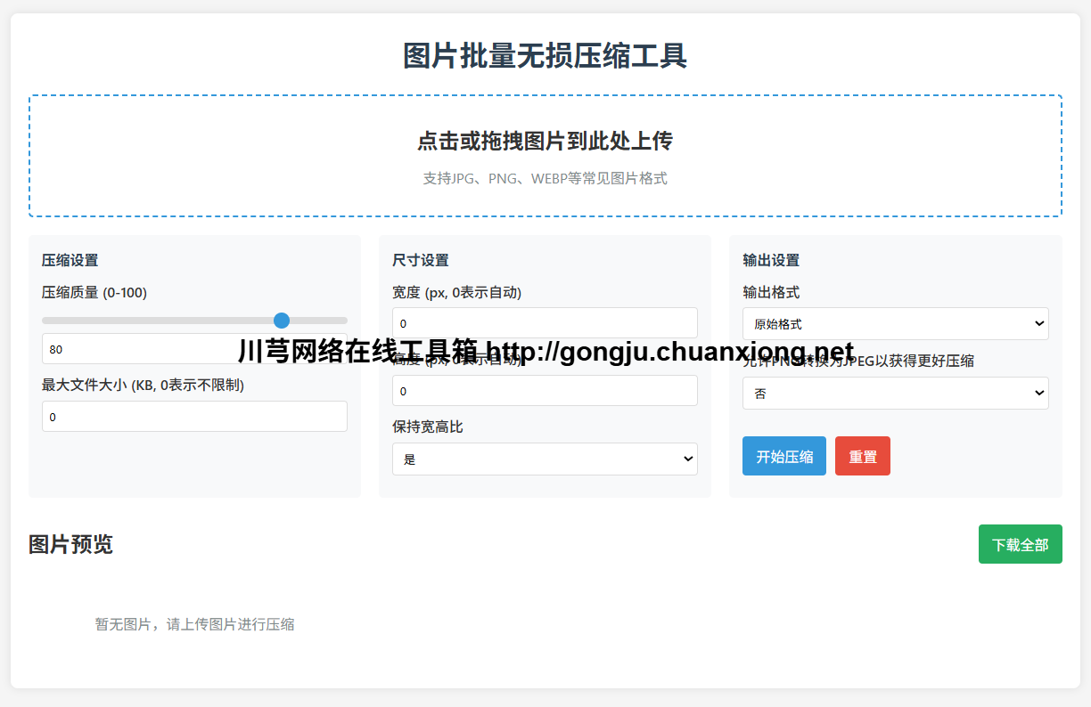 今天,我要向大家推荐一款强大的图片批量无损压缩工具,它集成于川芎网络在线工具箱中,能够帮助您快速、无损地压缩多张图片,显著减少文件大小,同时保持图片的清晰度。