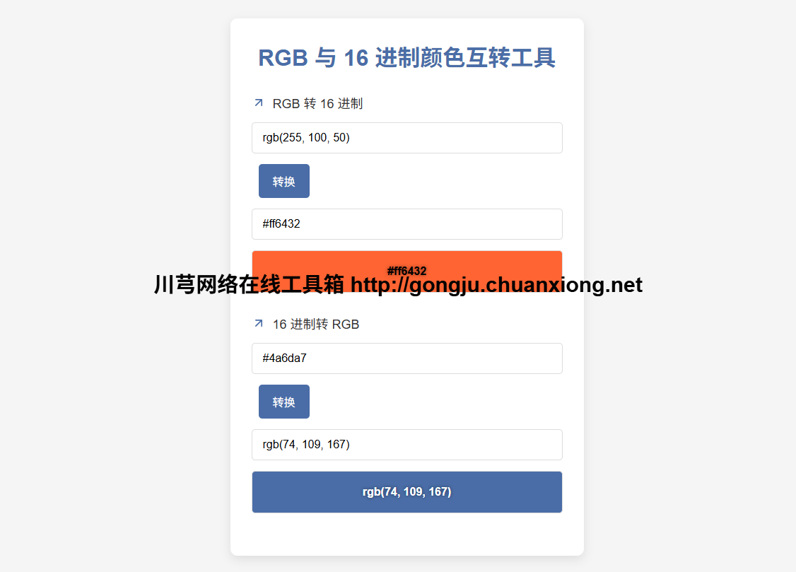 在川芎网络在线工具箱中,RGB 与 16 进制颜色互转工具是众多实用工具之一,专为设计师和开发者打造。无论您是专业创作者还是初学者,这个工具都能帮助您更高效地处理颜色转换任务,让您的工作流程更加顺畅。