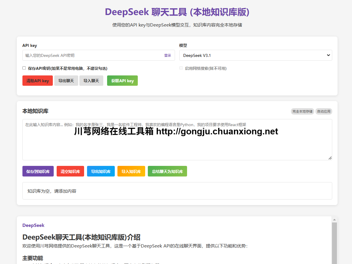 DeepSeek 知识库是集成在川芎网络在线工具箱中的一项核心功能,它允许用户在浏览器本地存储和管理个性化信息,这些信息会自动应用到与DeepSeek模型的对话中。与传统的云端知识库不同,DeepSeek 知识库的所有数据都存储在用户本地设备上,确保了隐私和安全。