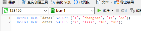 INSERT INTO `data1` VALUES ('1', 'zhangsan', '15', '88');