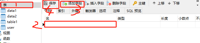 1.右键,新建表,手动输入字段,保存,此时表示空的没有数据