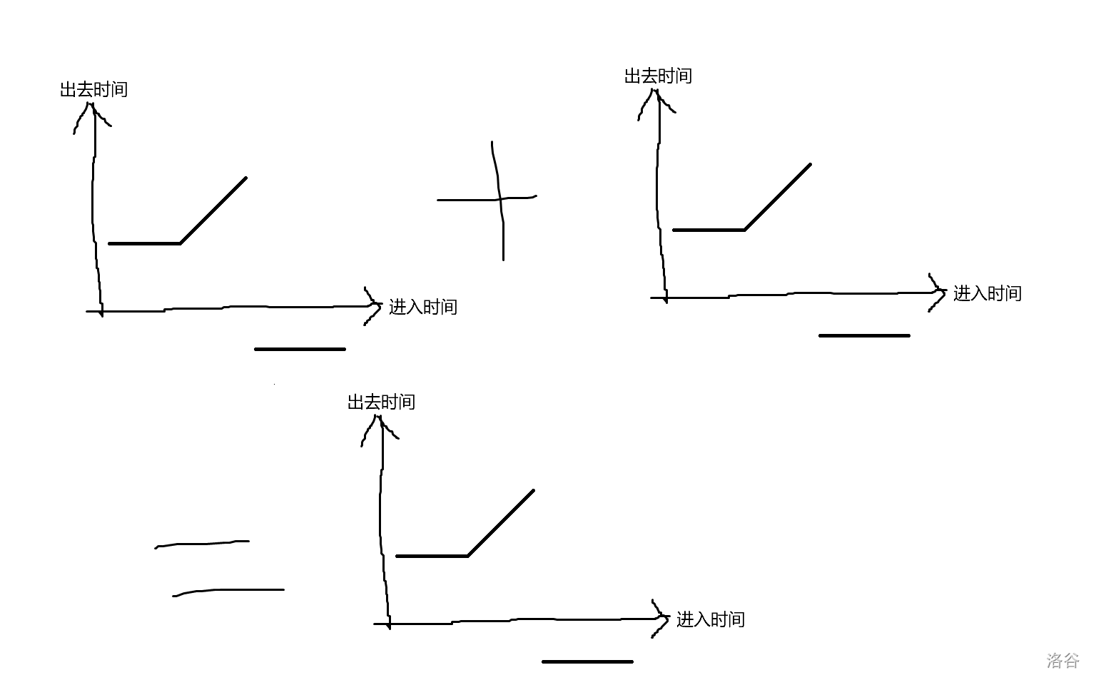 D:典题+板题。线段树维护是不难想到的。不难发现对于一个区间进入和出来的时间应该是如下的一个情况(数轴下面那段表示超时失败),而手玩后发现(甚至不用手玩,因为函数合并形状不变是必然的)下一个区间还是这样的。所以考虑维护两个转折的位置 t1t_1t1 和 t2t_2t2,每次简单 push_up 即可。