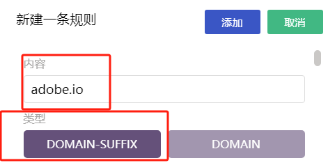 注意:按照这个方法操作,在开启规则模式代理后无法访问任何域名带有adobe的网站。关闭规则代理或者换成全局代理方可恢复正常访问。