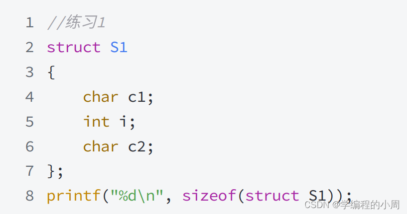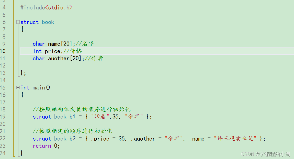 上面的一个代码块就是结构体的声明, struct是结构体的关键字,后面紧跟着的是结构体类型名book,