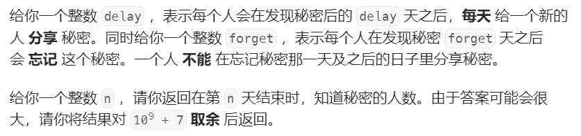 题意:恰好在第 i 天得知秘密的人,会在第 j=i+delay,i+delay+1,…,i+forget−1 天分享秘密,也就是把 known[j] 增加 known[i]。