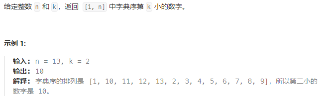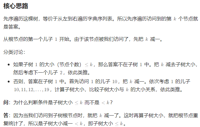 class Solution { public: int findKthNumber(int n, int k) { // 逐层统计node子树大小 auto count_subtree_size = [&](int node) -> int { int size = 0; // 子树大小不超过n怕,故用int long long left = node, right = node + 1; // l和r会超过int while (left <= n) { // 本层最小值为left, 最大是min(right, n + 1) - 1 size += min(right, n + 1LL) - left; left *= 10, right *= 10; }return size; }; int node = 1; k --; // 访问节点 node while (k > 0) { int size = count_subtree_size(node); if (size <= k) // 向右,跳过node子树->注意是size <= k node ++, k -= size; else node *= 10, k --; // 向下深入结点 } return node; } };