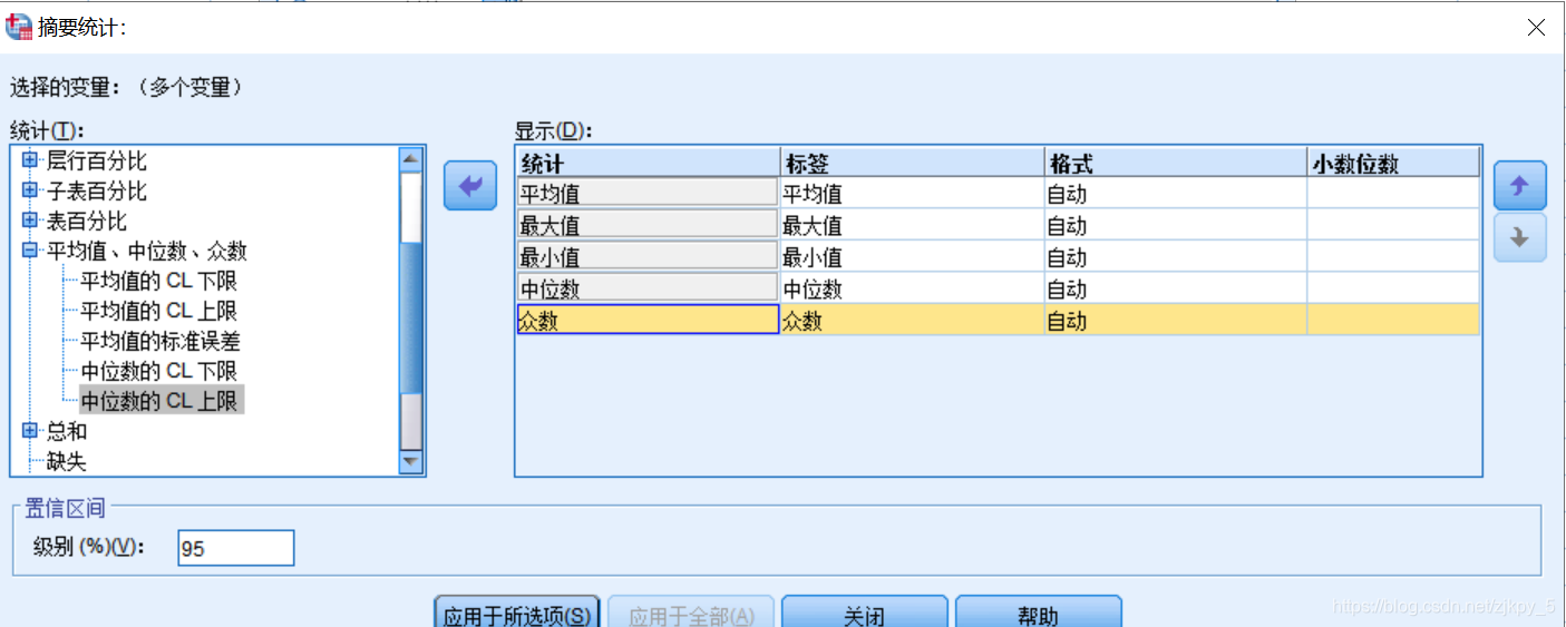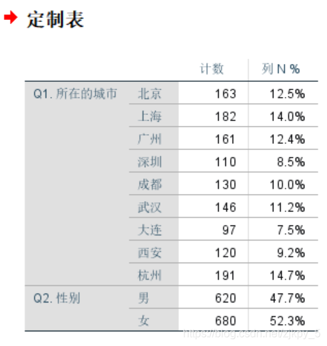 选中变量拖至【行】或【列】待出现公社框后松开,完成拖拽【摘要统计】,【统计】框中选择【列数%】,加入到右侧显示框中,【应用于所选项】【关闭】返回,【确定】