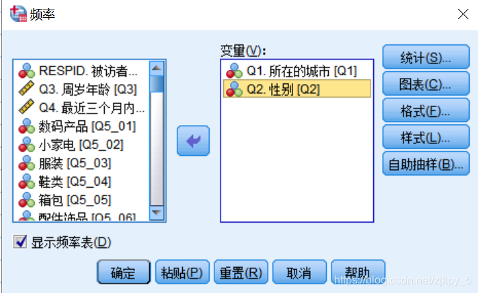【分析】【描述统计】【频率】,把需要频率分析的变量,移至右侧的【变量】框中