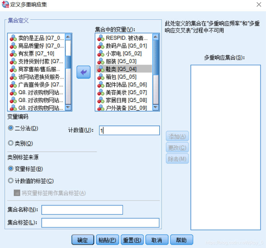 【分析】【定制表】【多重响应集】,把多选题的的选项变量移至右边框【集合中的变量】