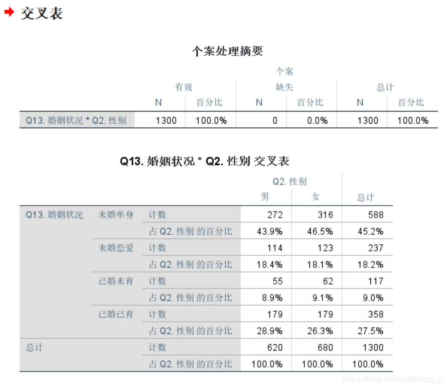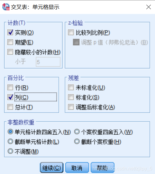 【分析】【描述统计】【交叉表】,将目标变量移至对应的【行】【列】中,,右侧【单元格】,选择统计量