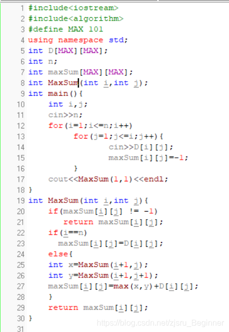 递归求解,会严重超时,因为出现重复计算;动归程序计算MaxSum(i,j)值的时候,保存下来,下次需要的时候,直接取出计算,这样就避免了重复计算。