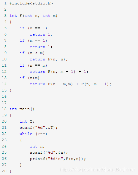 划分中含有m时,即划分的形式是{m,{x1, x2, ..., xi}},则{x1, x2, ..., xi}个数为f(n-m,m);