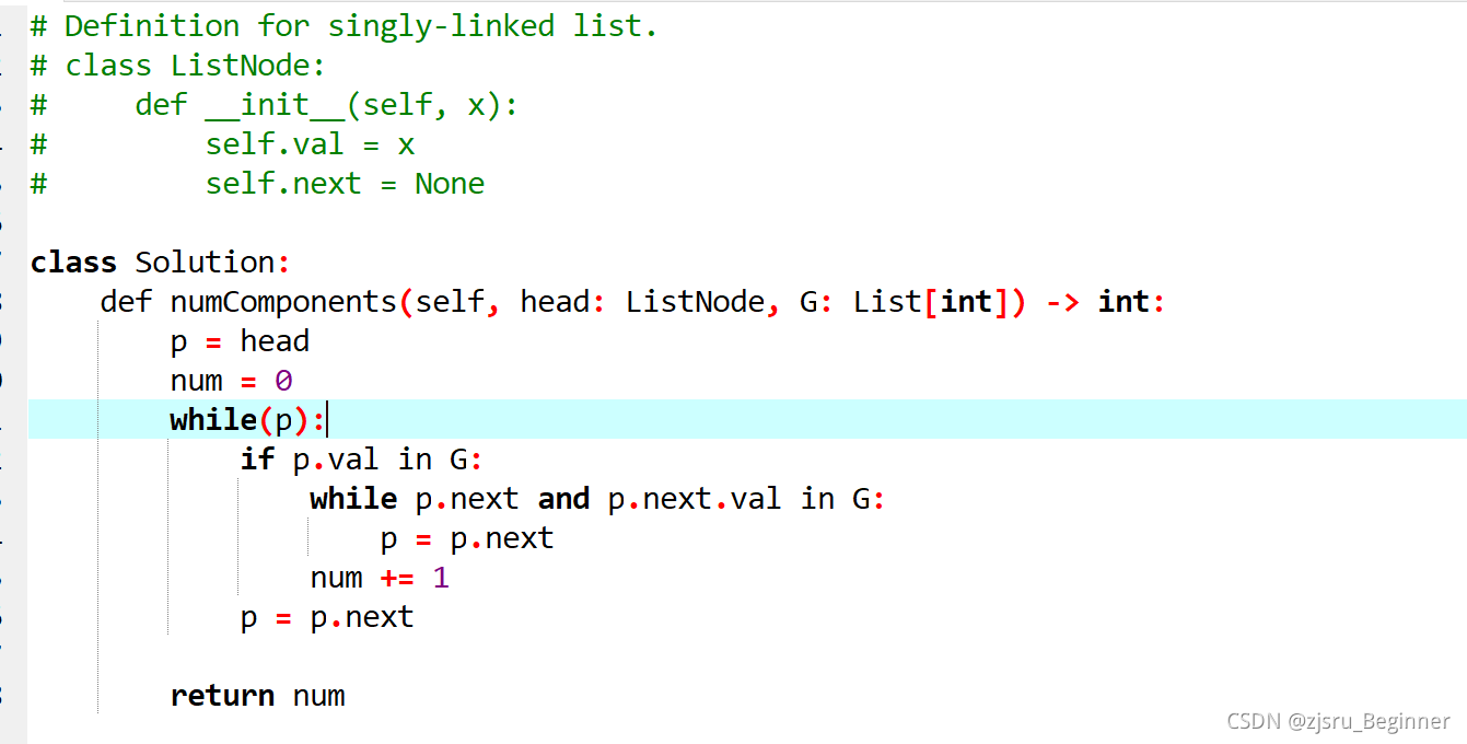 其实,在这个题目中,自己遇到的问题就是,在考虑WHILE语句时,一开始没有办法考虑充分,后来在报错之后,明白其实对于链表每个结点若出现在列表中的情况,只需要继续扫描链表看是单个元素还是有连续的元素,在当前节点已经在列表中的基础上,判断下一个连续结点是否也在,即判断该组件是单个结点还是多个即可。