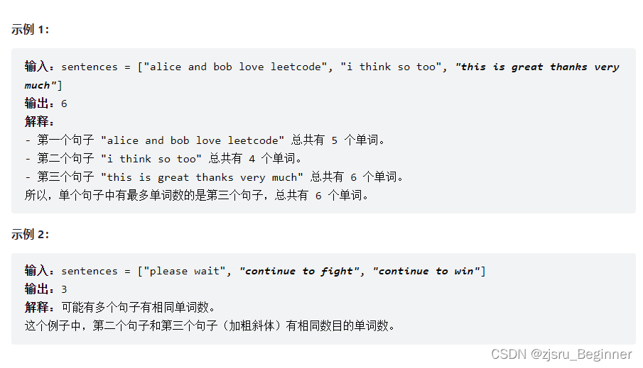 题目很简单,需要计量句子中最多的单词数,只需要计量句子中空格的数量,句子中空格的数量+1就等于句子中所有单词的数量。