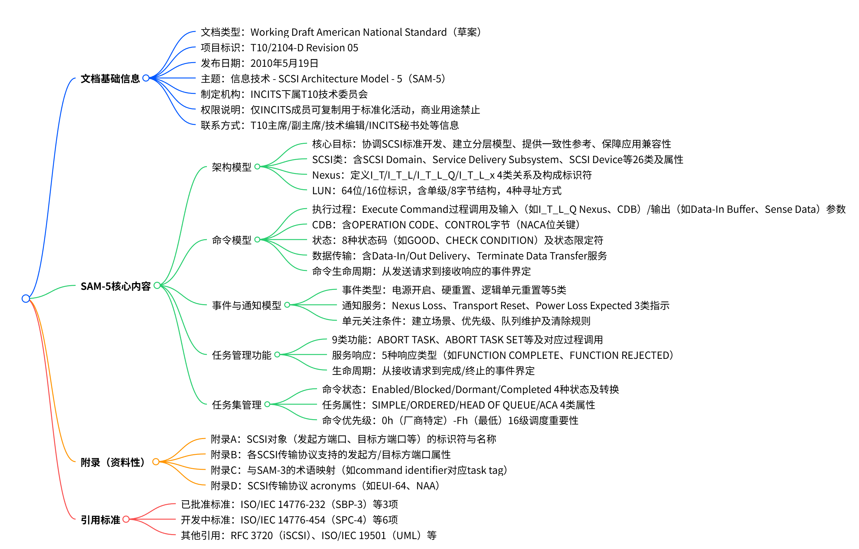 SAM5是 2010 年 5 月 19 日发布的American National Standard(美国国家标准)草案,项目编号为T10/2104-D Revision 05,聚焦于信息技术领域的 SCSI Architecture Model - 5(SAM-5) ;它由 INCITS(国际信息技术标准委员会)下属的 T10 技术委员会制定,目前并非最终标准且仍在修改中,仅用于审查和评论;文档核心内容涵盖 SAM-5 的架构模型(含 SCSI 类、Nexus、LUN 等)、命令模型(含命令执行、状态、数据传输等)、事件与通知模型、任务管理功能(如 ABORT TASK、CLEAR ACA 等 9 类功能)、任务集管理(含命令状态、任务属性等) ,同时包含多个资料性附录,还明确了文档的复制权限(仅 INCITS 成员用于标准化活动可复制,商业用途严禁)及联系方式(如 T10 主席、副主席、秘书处等)。