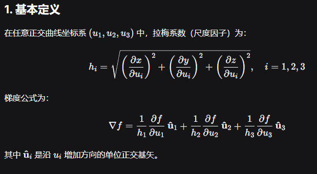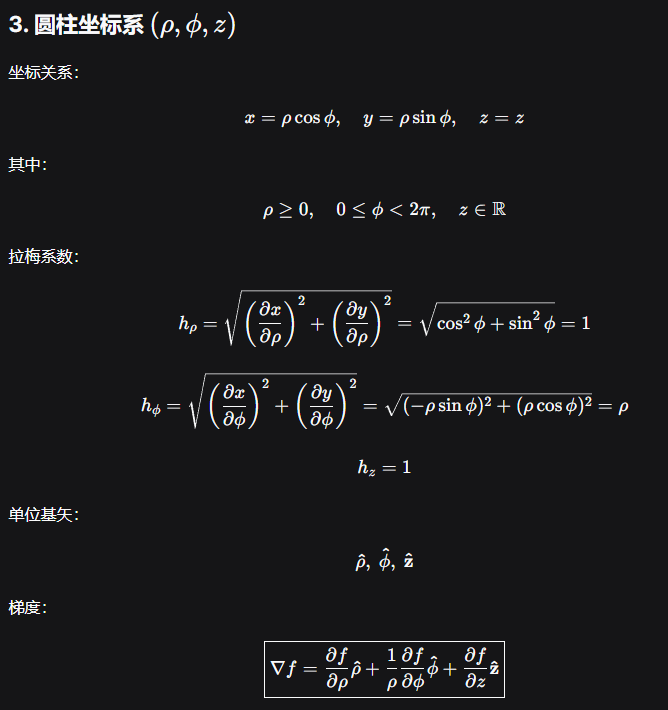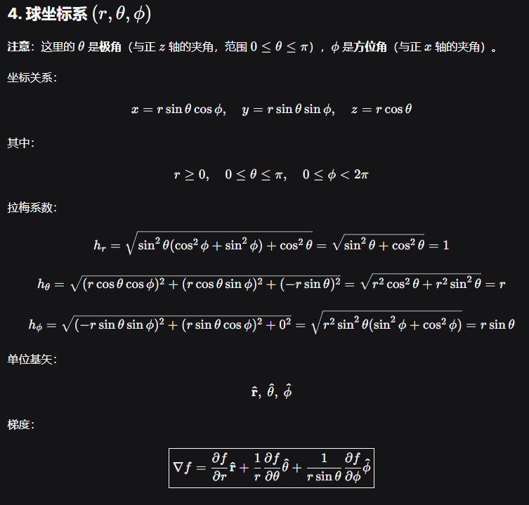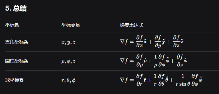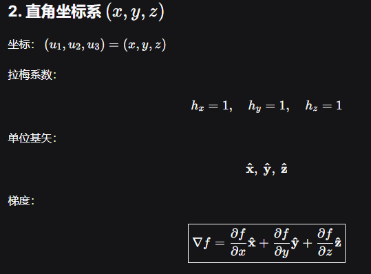 下面给出标量场梯度 ∇f∇f 在三种常用正交曲线坐标系中的表达式。