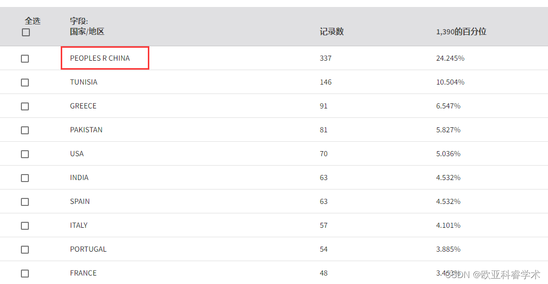 排名前三的发文国家/地区分别为中国、突尼斯和希腊。国人占比排名第一,占比24.245%,可见该期刊对国人非常友好。