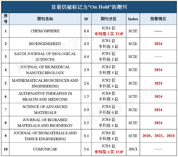 经小编查询,此次更新后,共有7本“On Hold”期刊被数据库剔除,其中还包括2024年预警期刊。期刊详情如下: