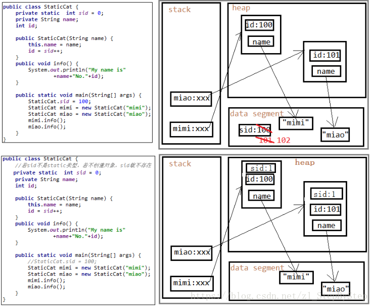 例3:分别画出含有和不含有静态属性sid·的内存图:
