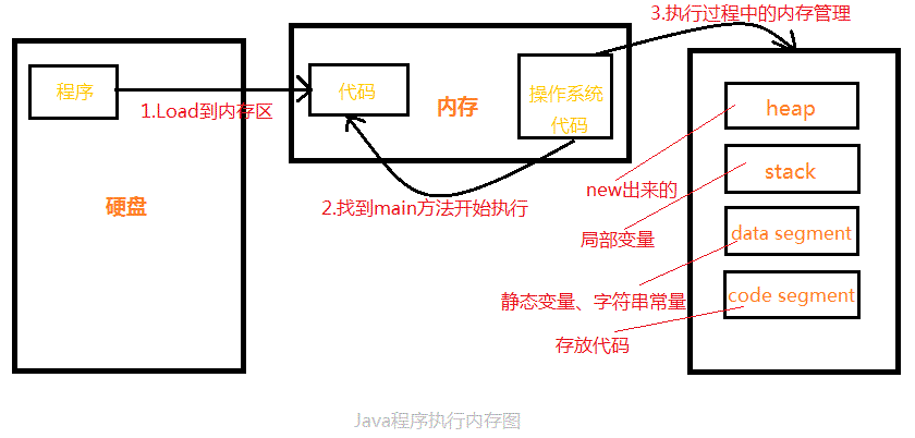 程序是静态的,存在于硬盘上,只有Load到内存中经过操作系统相关代码调用后分配内存开始运行,Java代码中又把内存分为4块儿,如下图:heap堆、stack栈、data segment、code segment。