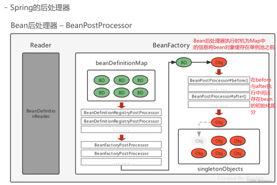 Bean后处理器的作用在Spring中是对Bean对象做功能增强的,Bean后处理器中有两个方法,暂时把他们叫为前方法与后方法。