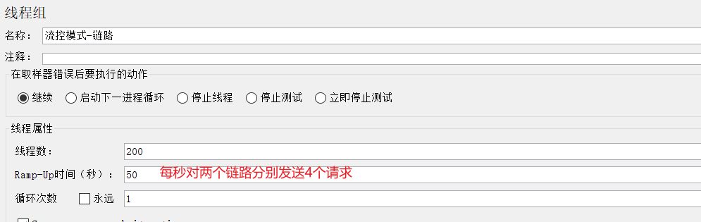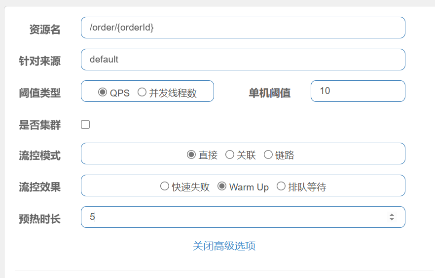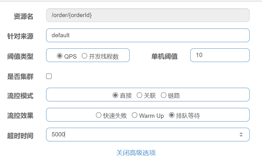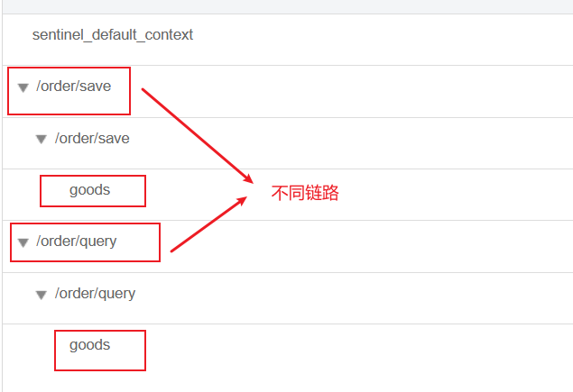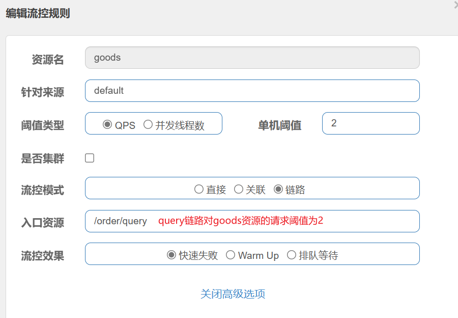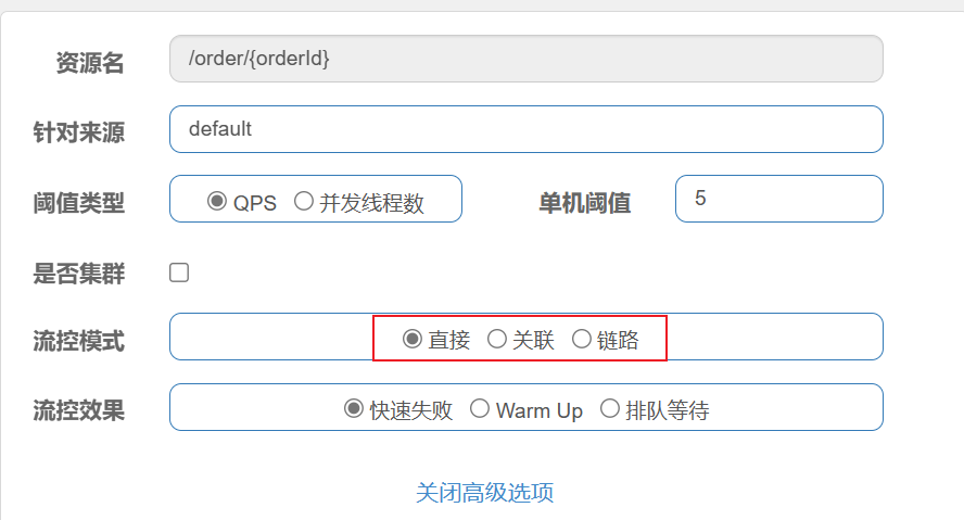 - 链路模式:统计从指定链路访问到本地资源的请求,触发阈值时,对指定链路限流。