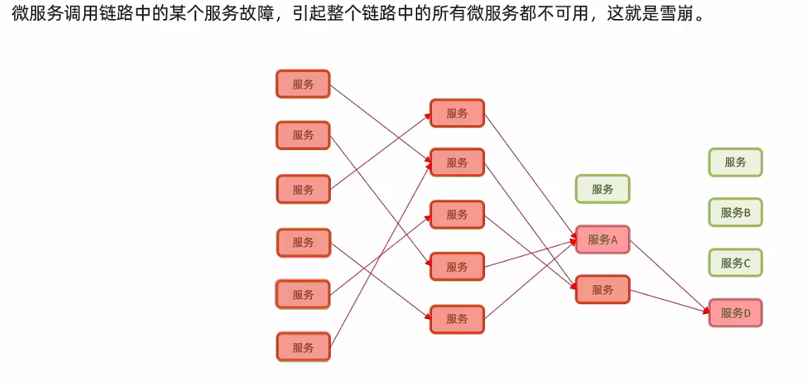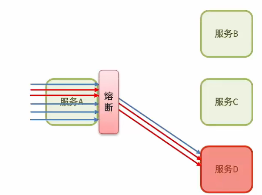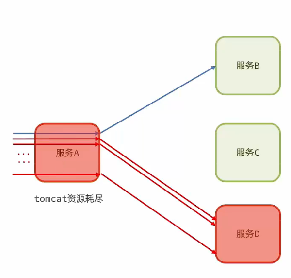 在微服务中,当服务D宕机,服务A去调用服务D时,由于服务A等待服务D的返回结果而阻塞,在阻塞期间不会释放tomcat的连接资源,当持续的调用服务D请求发送,tomcat的资源总会被耗尽。这时调用服务B与C的请求也会阻塞在服务A中,导致服务A也宕机。