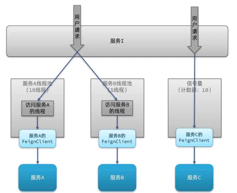 - 信号量隔离:只有一个线程池,对业务已经使用的线程进行统计,当到达一定数量后,不会对该业务分配更多的线程。