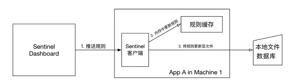 控制台将配置的规则推送到Sentinel的客户端,客户端会将规则保存在本地文件或数据库中。微服务会定时去本地文件或数据库中查询规则是否改变。来更新本地规则。