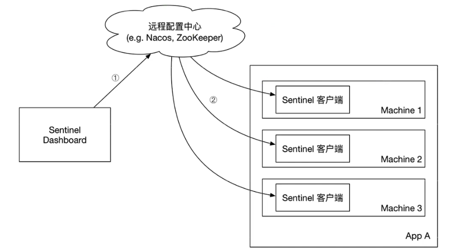 控制台将配置规则推送到远程配置中心,例如Nacos。Sentinel客户端监听Nacos,获取配置变更的推送消息,完成本地更新。这是推荐的一种实现方案