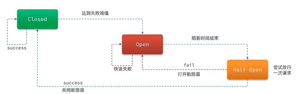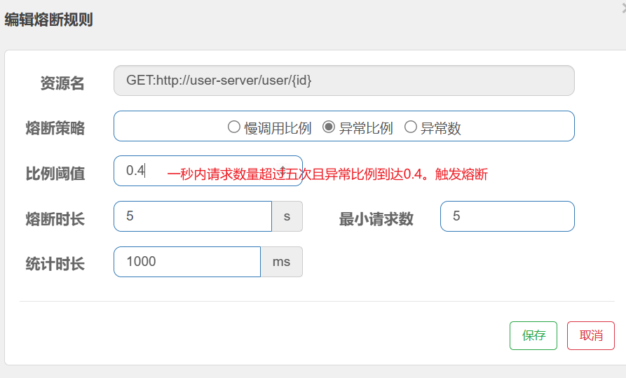统计指定时间内的调用,如果调用次数超过指定请求数,并且出现异常的比例达到设定的比例阈值(或超过指定异常数),则触发熔断。