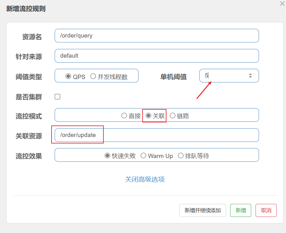 - 关联模式:统计与当前资源相关联的另一个资源,当触发阈值时,对关联的资源进行限流
