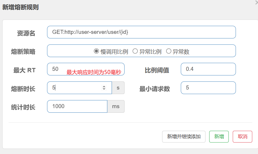 - 慢调用比例:某个业务的请求耗时量久的数量与该业务总请求数量的比例