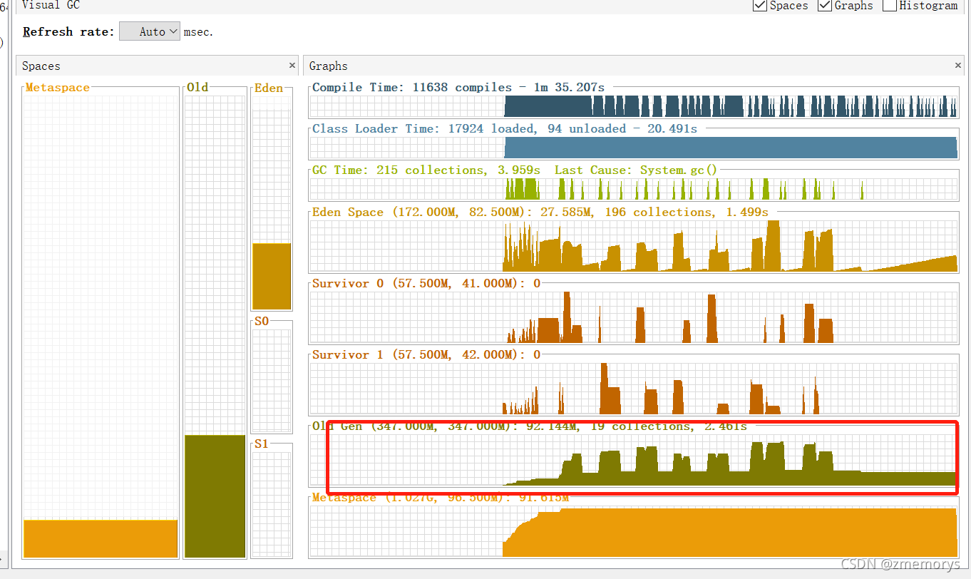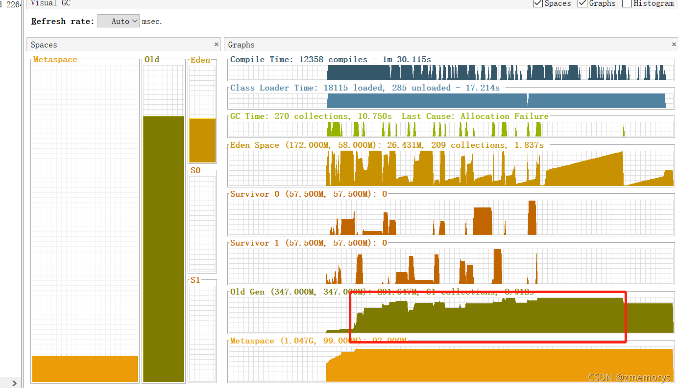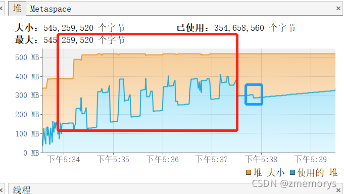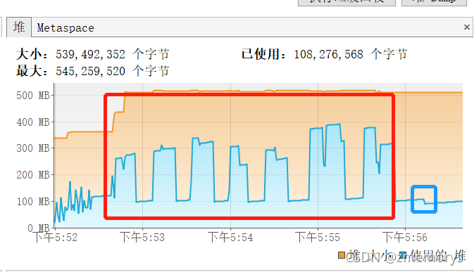 看堆内存从开始执行的时候并不是有规律的波动,如红色框中。