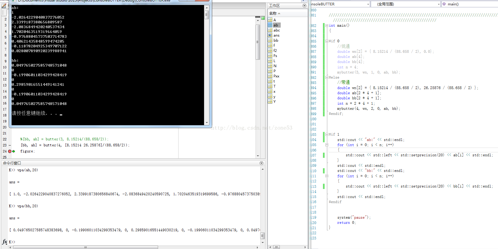 本文分享了一位作者在找不到Matlab中butter函数的C语言版本后,自行实现的过程与心得。主要实现了低通和带通部分,并讨论了在VS2015环境下使用complex.h进行复数运算的方法。