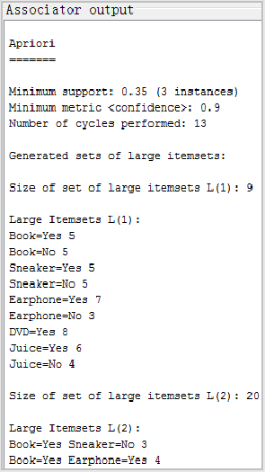 由于规则置信度并未提供这条关联关系在所有交易中所占的比例(覆盖程度很低),即包含在关联关系中的购买行为是普遍交易行为,还是个别行为不得而知。下面我们可以使用支持度这个统计量来度量。用支持度度量包含了关联关系中出现的属性值的交易占所有交易的百分比。