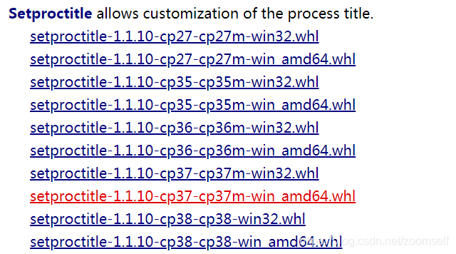 1:https://www.lfd.uci.edu/~gohlke/pythonlibs/#setproctitle 下载对应python版本的setproctitle whl 文件直接pip 安装