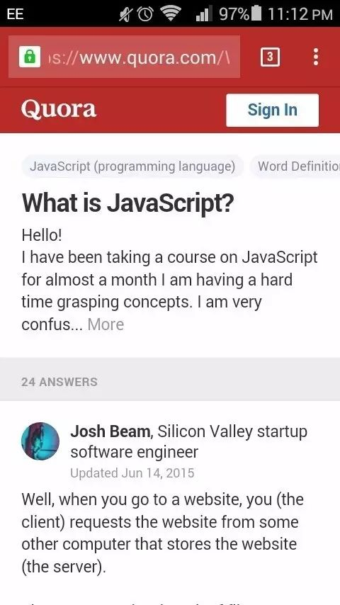 另一个开发中的特性就是关于 <meta name="theme-color"> 的定义。它的值可以是包括HEX和RGB在内的任何你在CSS中使用的颜色。一旦页面中如此使用了,只要浏览器和操作系统定制了用户界面,这个新的meta标签就会建议它们使用这个颜色。你可以看到Android端的Chrome浏览器已经像下图这样做出这样的行为。