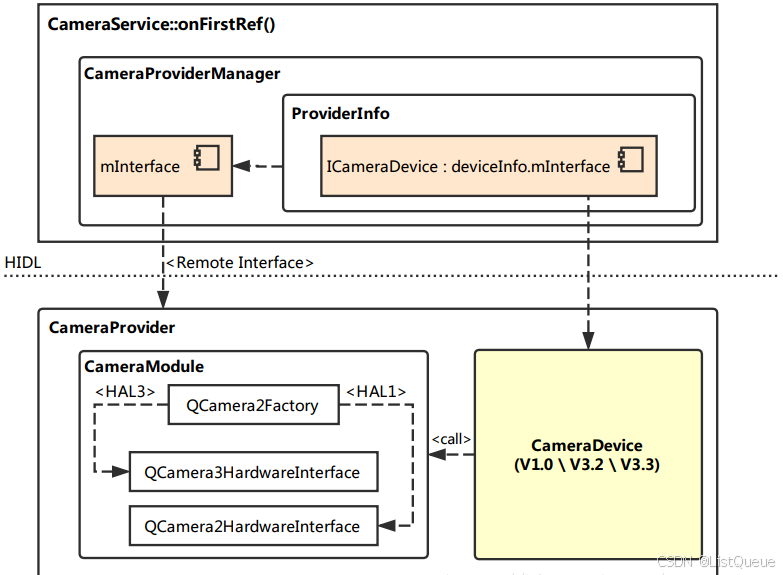 在 Android O 中,系统启动时,会启动一个 CameraProvider 服务,它是从 cameraserver 进程中分离出来,作为一个独立进程 android.hardware.camera.provider@2.4-service 用来控制 camera HAL,cameraserver通过 HIDL 机制于camera provider进行通信。HIDL源自于 Android O 版本加入的 Treble 机制,它的主要功能是将 service 与 HAL 隔离,以方便 HAL 部分进行独立升级,类似于 APP 与 Framework 之间的 Binder 通信机制,通过引入一个进程间通信机制而针对不同层级进行解耦(从 Local call 变成了 Remote call)。如下图: