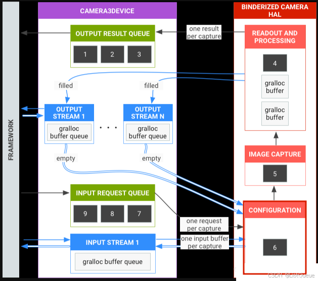 每个被submit到hal的request都必须携带stream。stream分为input stream和output stream:input stream对应的buffer是已有图像数据的buffer,hal对这些buffer进行reprocess;output stream对应的buffer是empty buffer,hal将生成的图像数据填充的这些buffer里面。