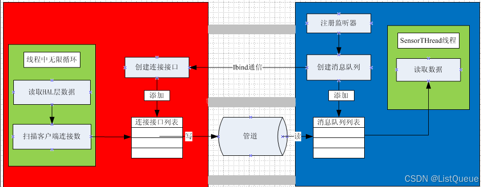 从下图中可以看出SensorClient和SensorService端各有一个线程用于数据的传输,SensorService端的线程复制从hal层读取数据,并将数据写入到Client端创建的管道中,SensorClient则通过管道读取数据,上报给app层。